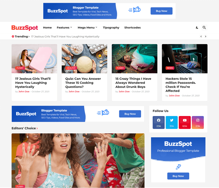 BuzzSpot blogger template is the most modern viral template of 2021, which will provide you with amazing and unique features. If ads are your main source of monetization, BuzzSpot is undoubtedly your best choice, as it has numerous flexible and customizable sections to add your ads.