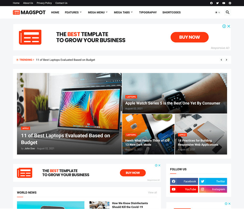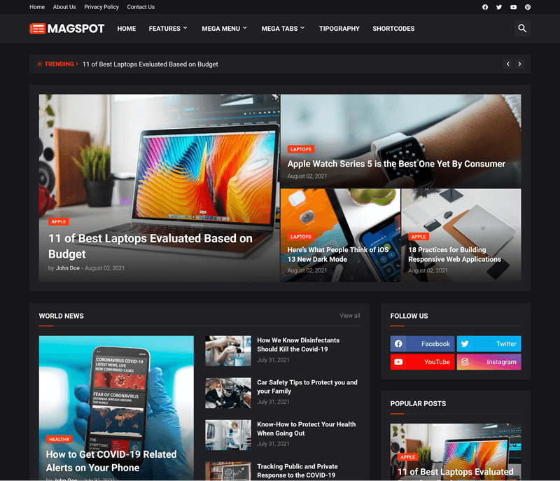 Magspot is fully customizable and all modifications can be done with a few clicks or through interactive and flexible shortcodes like no other template. Magspot has several customization options and everything is carefully described in a complete documentation supported by a video tutorial. So, no coding knowledge will be needed.