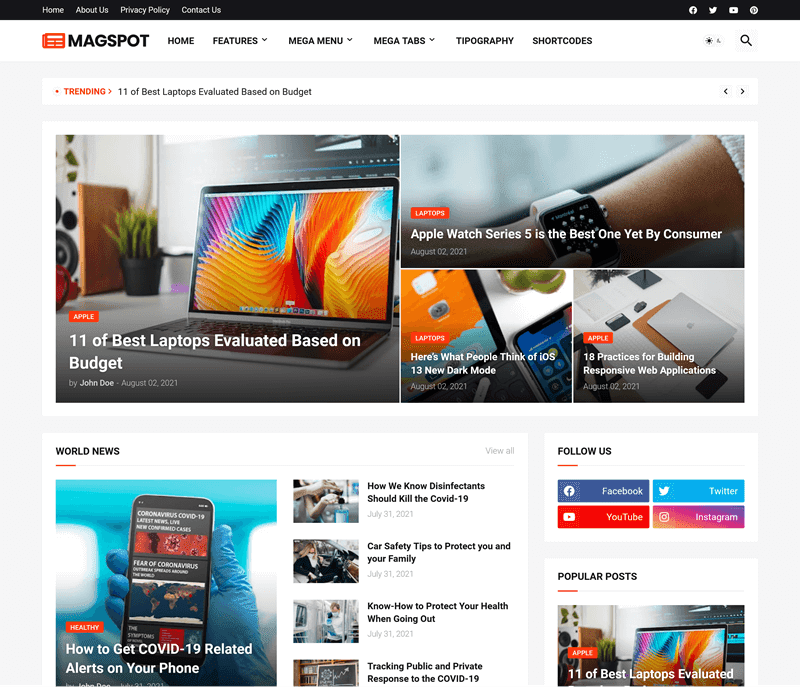Magspot is fully customizable and all modifications can be done with a few clicks or through interactive and flexible shortcodes like no other template. Magspot has several customization options and everything is carefully described in a complete documentation supported by a video tutorial. So, no coding knowledge will be needed.