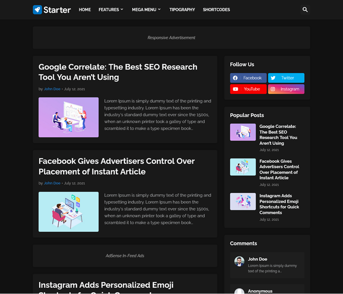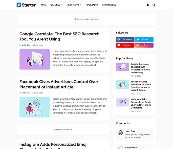 Starter is a professional and super clean responsive blogger template. Starter blogger template is powerful, fast and fully optimized for search engines. Starter blogger template is mobile friendly, It is also fully compatible with google adsense and other monetization platforms. Starter is fully customizable and has many unique features so you can create your own professional website on blogger/blogspot platform.